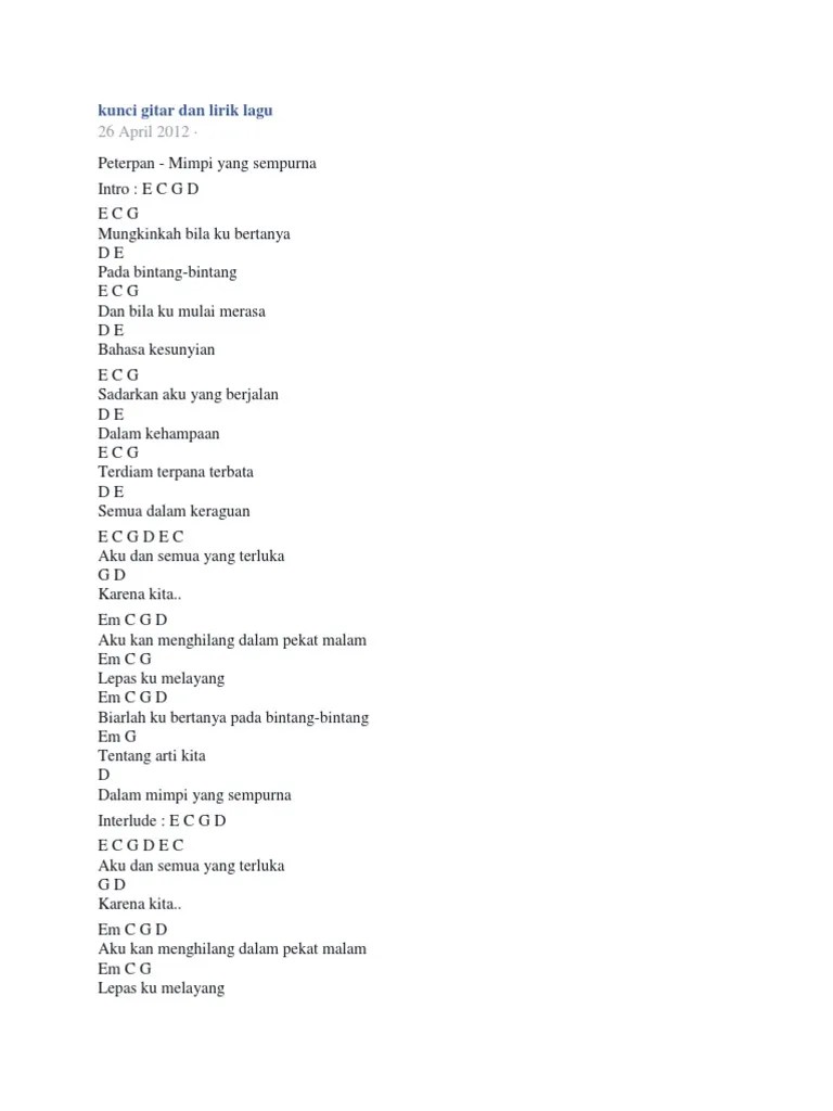 Berikut ini lirik lagu cinta yang sempurna dari kangen band. Lagu ini merupakan singel dari . Seperti bintang dilangit begitu cinta kita tak kan pernah binasa meski terhapus masa *courtesy of . | smule social singing karaoke app. Layanan mobile dari situs entertainment terbesar indonesia, kapanlagi.com. Kangen band reunion, acara synchronize fest 2020, (15/11/2020). Bagai bintang dilangit begitu cinta kita tak kan pernah binasa meski terhapus masa terima kasih. Seperti (bagai) bintang dilangit / begitu cinta kita / tak kan pernah bi. 27 september 2021 ·bacaan 1 menit. Em c em d b # em g bagi bintang dilangit d bagi pecinta kita b takkan pernah binasa em meski terhapus masa ## em . Lyrics for cinta yang sempurna by kangen band. Lirik lagu kangen band cinta yang sempurna lyrics. S′perti bintang di langit, begitu cinta kita takkan pernah binasa meski terhapus masa teri.